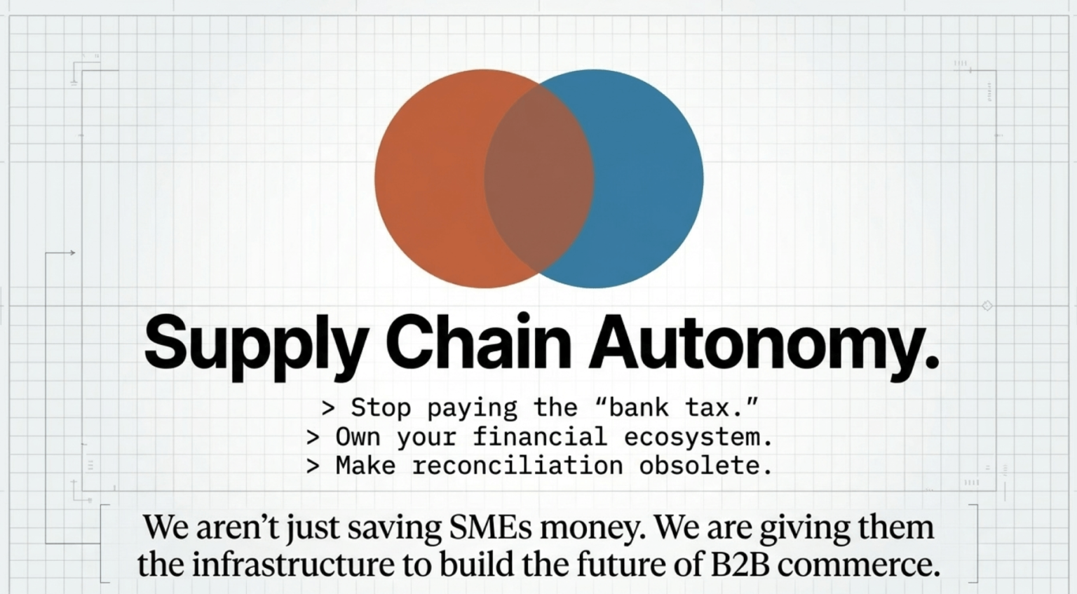 We lead with the cashback because "found money" is the ultimate wedge - it’s immediately tangible. But the long-term play is the Automation of the Supply Chain . By removing the friction of 3-day settlement cycles and manual reconciliation, we aren't just saving SMEs money - we are giving them the infrastructure to own their own financial ecosystem.