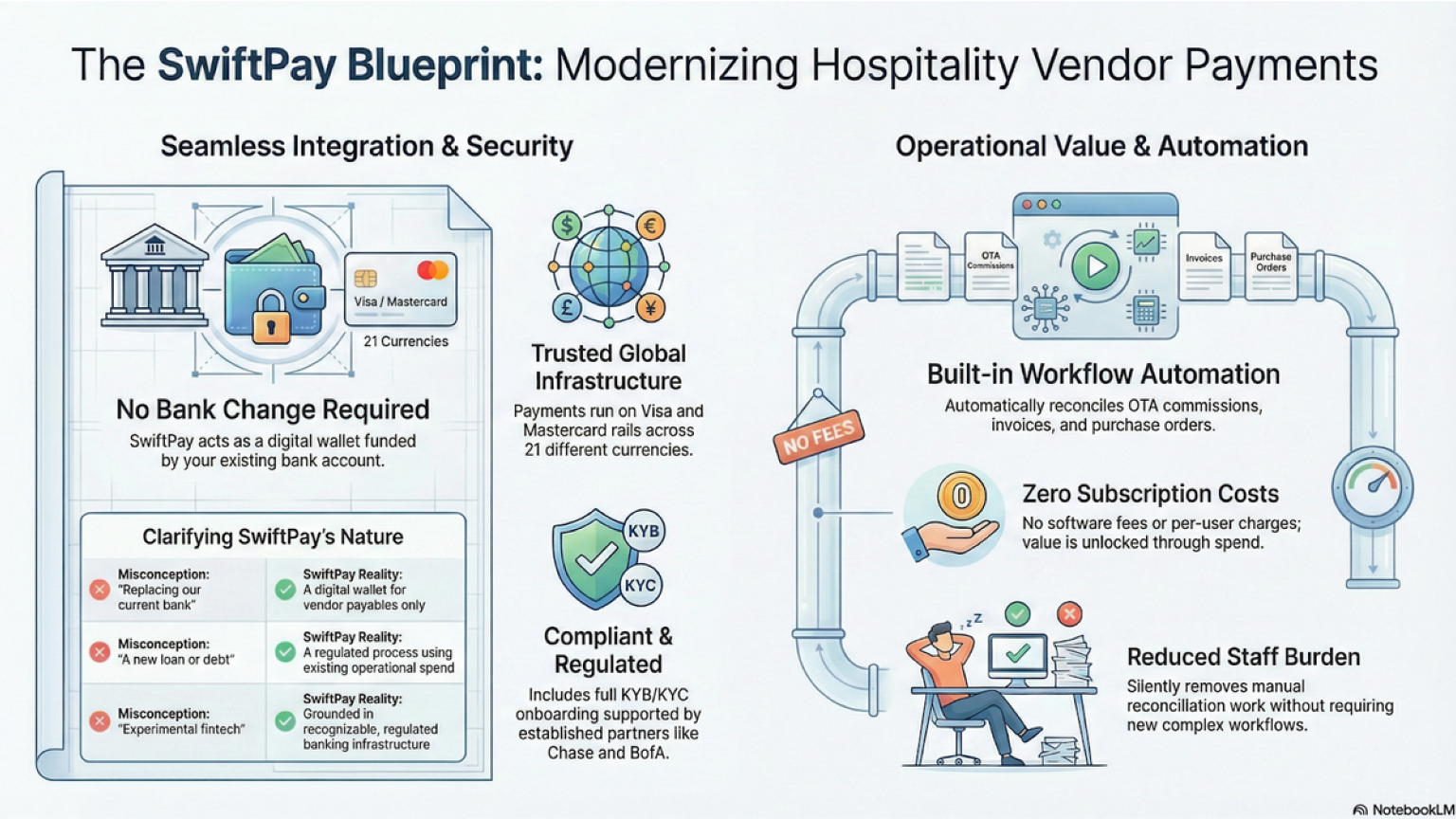 Hotels keep their current banking setup intact. SwiftPay simply becomes a smarter way to execute payables - without turning into a “new bank.”